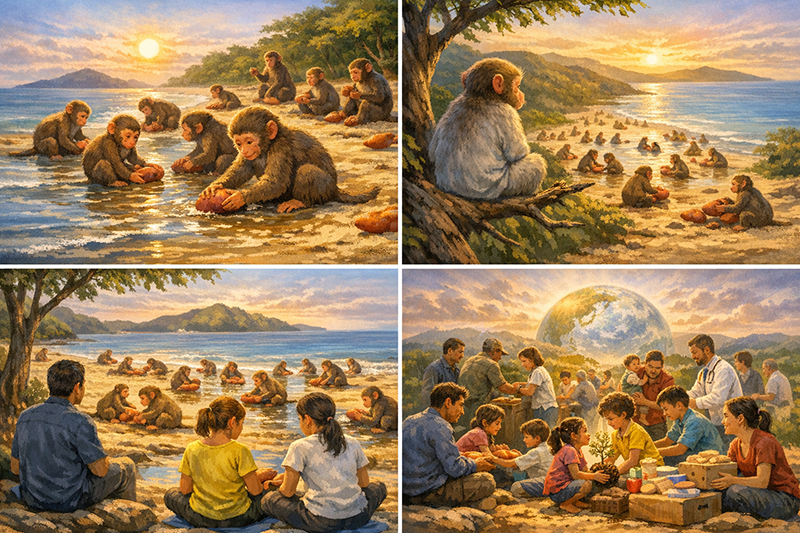 As the morning sun was rising, Imo noticed from her tree high in the mountains that all the young monkeys on the entire island were busy washing the sandy sweet potatoes. She was excited and surprised.